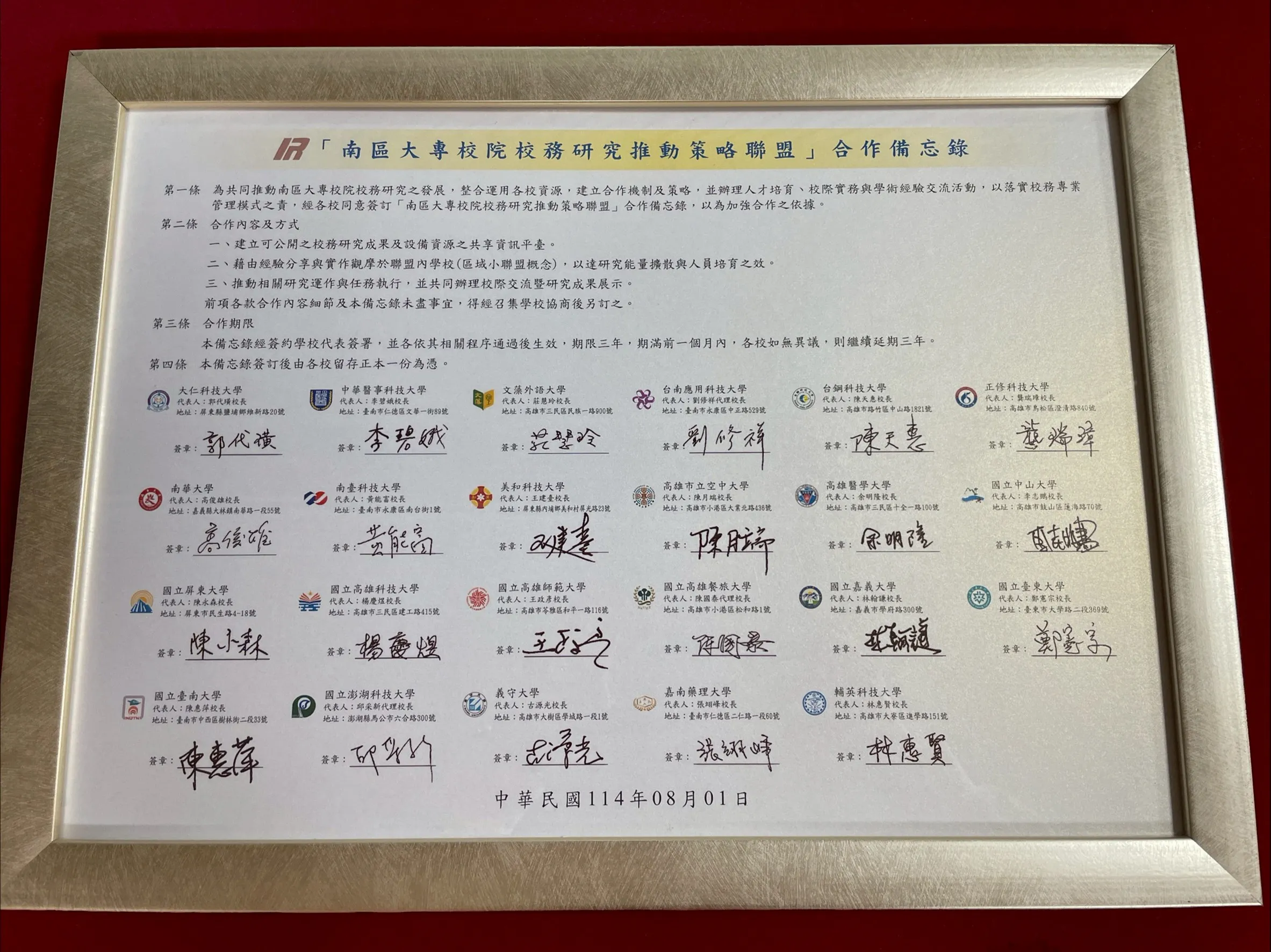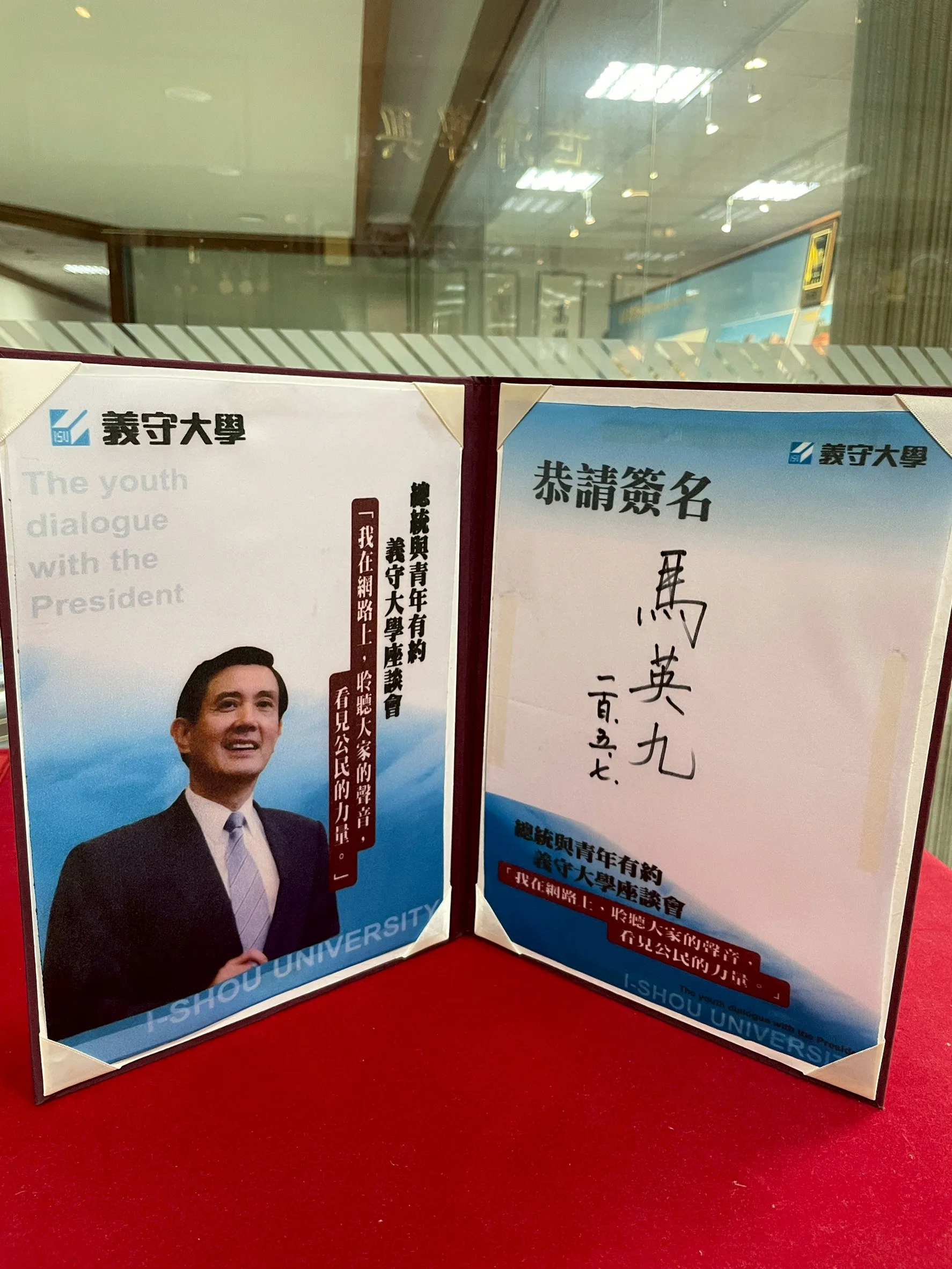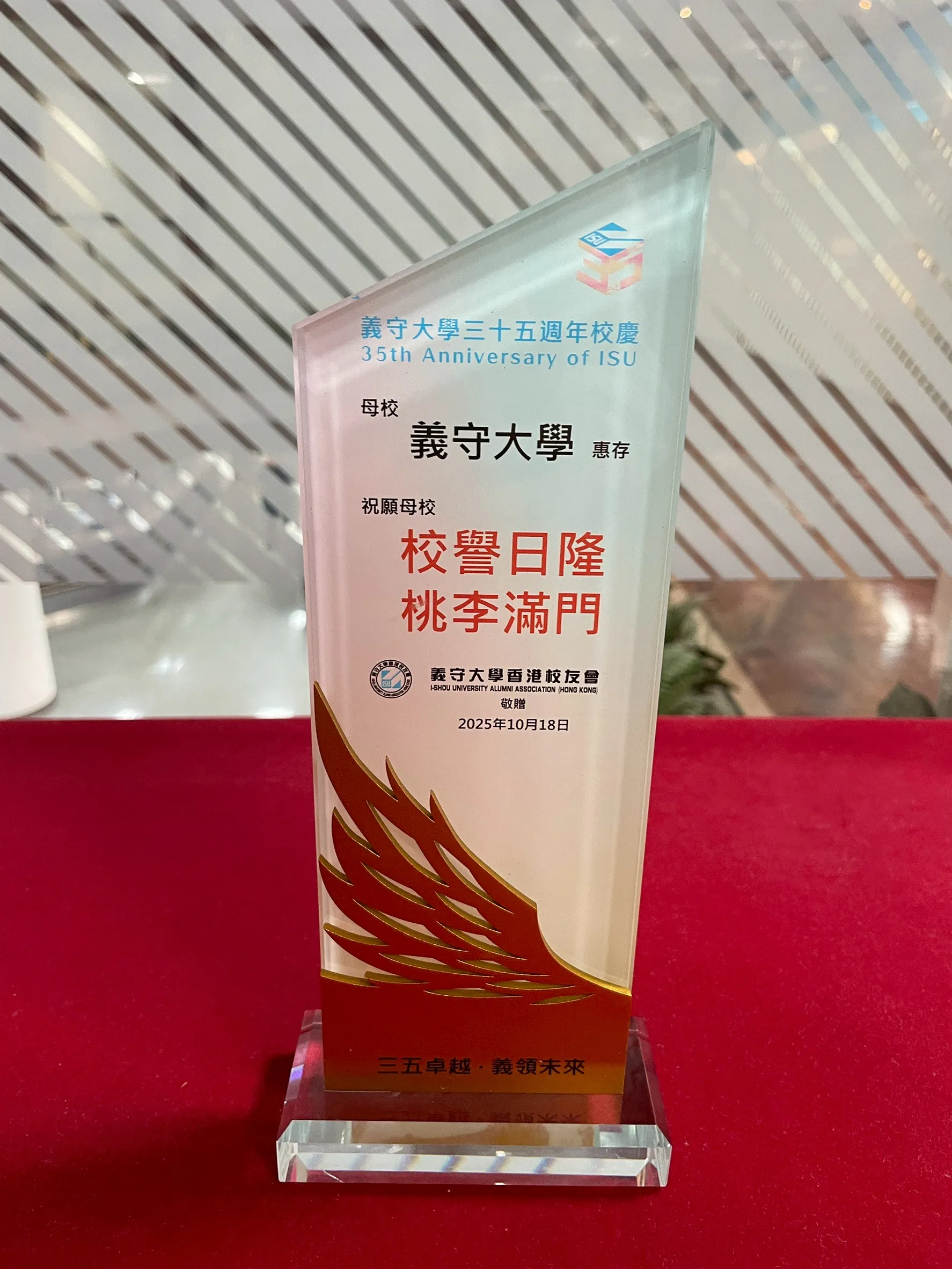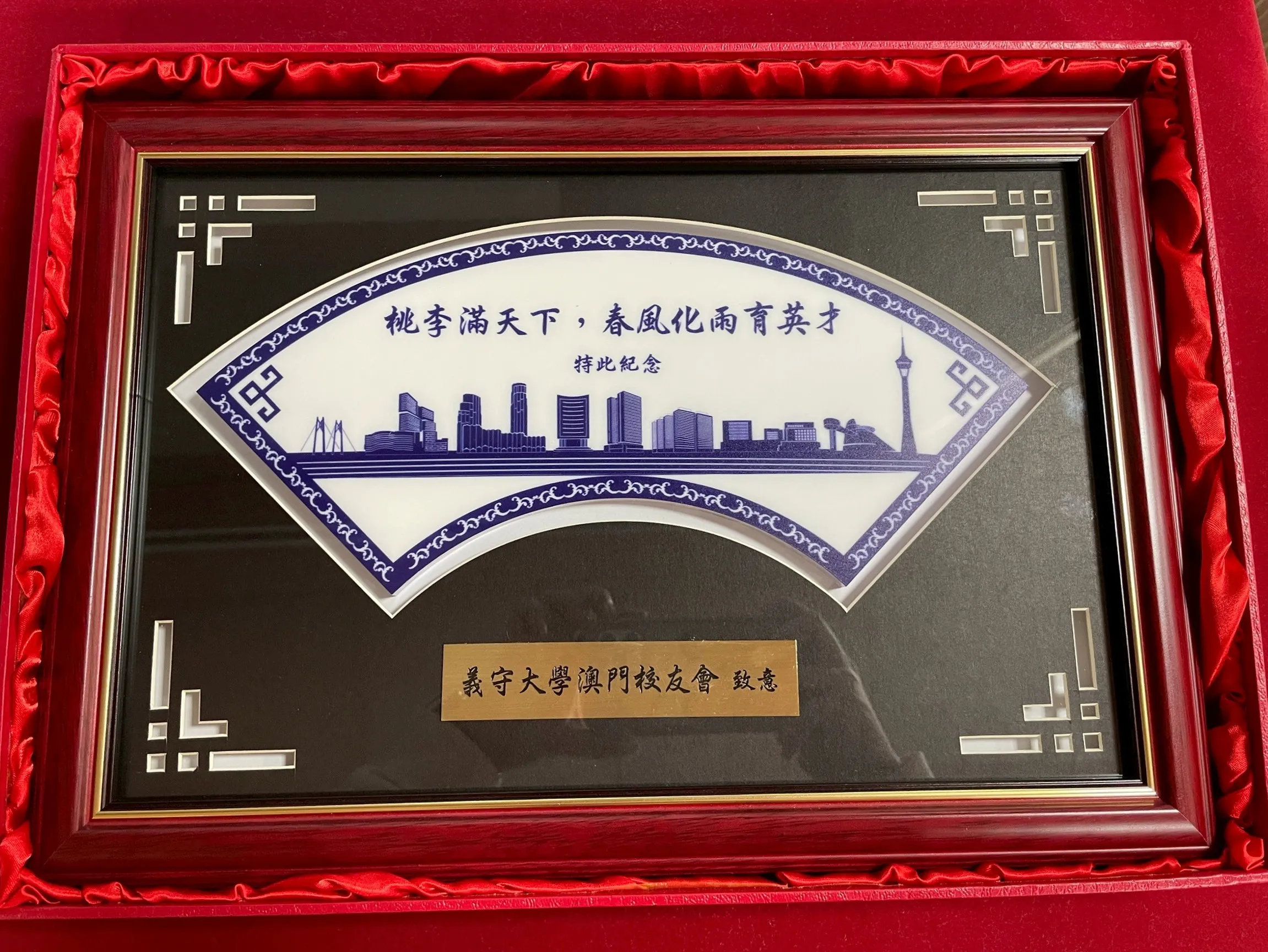 影像典藏記憶 館藏文物 精選校內外致贈與重要紀錄文物,把重要的瞬間,收藏成可被看見的記憶 ✕ 民國114年 義守大學澳門校友會致贈 ✕ 民國114年 義守大學香港校友會致贈 ✕ 民國114年 「南區大專校院校務研究推動策略聯盟」合作備忘錄 ✕ 民國114年 綠色大學聯盟終身會員錦旗 ✕ 民國114年 114年畢業生致贈 ✕ 民國100年 總統與青年有約義守大學座談會 ✕ 民國100年 總統府致贈蝴蝶蘭碗盤